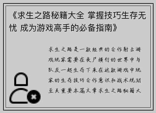 《求生之路》是一款经典的合作射击游戏,玩家需要在丧尸横行的世界中与队友一起生存下来。在这款游戏中,玩家的生存技巧、合作意识和战术规划至关重要。本篇文章《求生之路秘籍大全 掌握技巧生存无忧 成为游戏高手的必备指南》将详细探讨提升玩家技能的各种技巧和策略,帮助玩家掌握生存诀窍,成为游戏中的高手。我们将从四个方面进行详细阐述:游戏中的基本技巧、武器与物资管理、团队合作的重要性以及应对敌人和僵尸的策略。每个方面都将提供多种实用建议和细节,助力玩家在激烈的游戏环境中取得胜利。